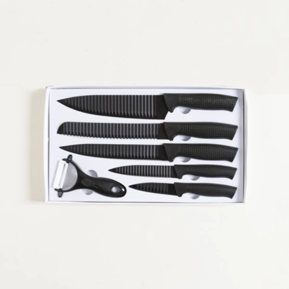 Set x 5 Cuchillos Acanalados Hoja Y Mango Negro + Pela Papas